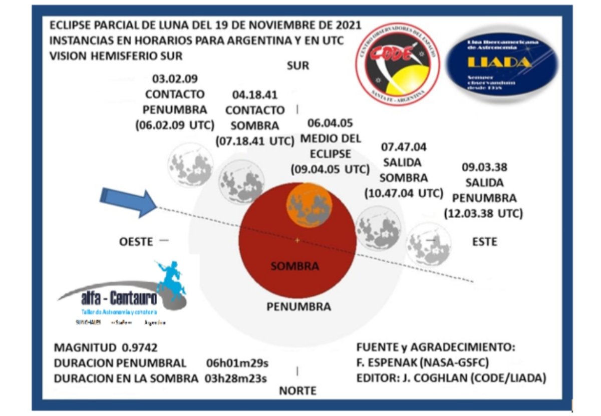 (Por: Alfa Centauro) – En la madrugada del viernes 19 de noviembre de 2021 observaremos en la República Argentina y gran parte del Mundo, un Eclipse Parcial de Luna, el que alcanzará su punto máximo a las 09.04 (Medio del Eclipse) cuando la Luna ya esté bajo de nuestro horizonte occidental. Este día, la Luna atravesará casi en su totalidad (un 97%) la sombra de la Tierra.