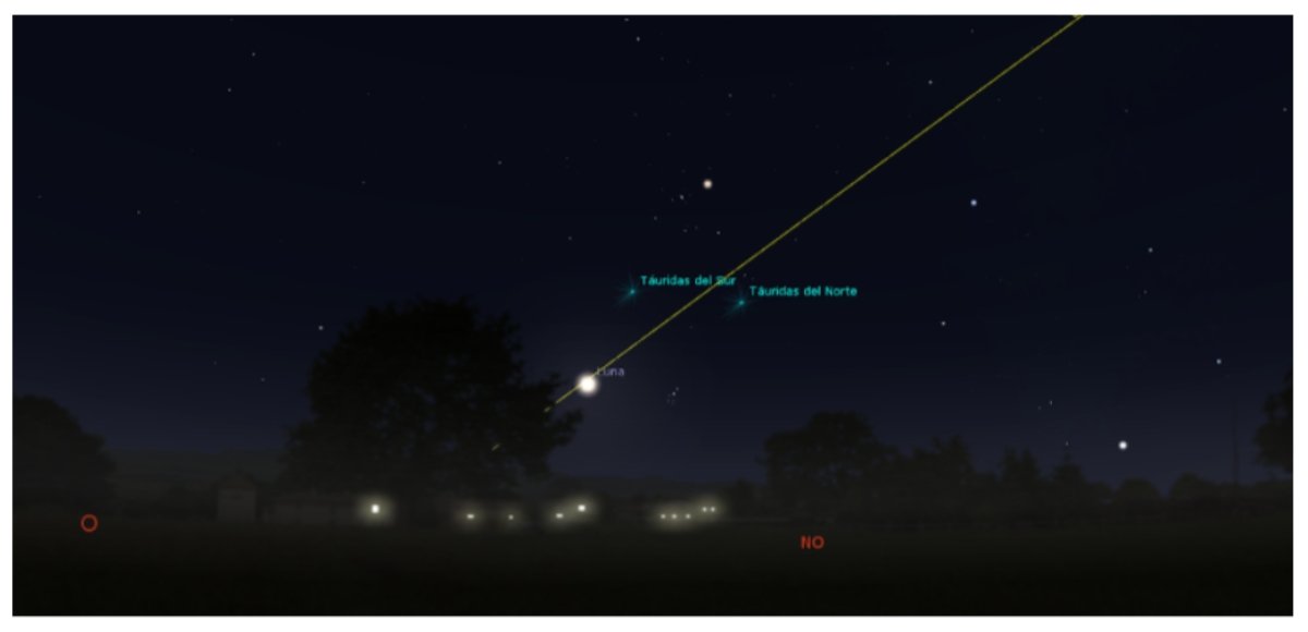 Así veremos a la Luna aproximadamente a las 05.00 con las estrellas de la constelación de Tauro detrás de ella (Programa de simulación Stellarium).