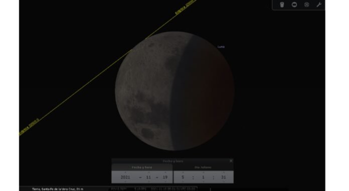Donde estará la luna a las 5.00 del viernes 19 de noviembre de 2021, sólo será posible observar desde nuestra ciudad el principio del eclipse, luego el máximo del mismo la luna estará por debajo del horizonte.