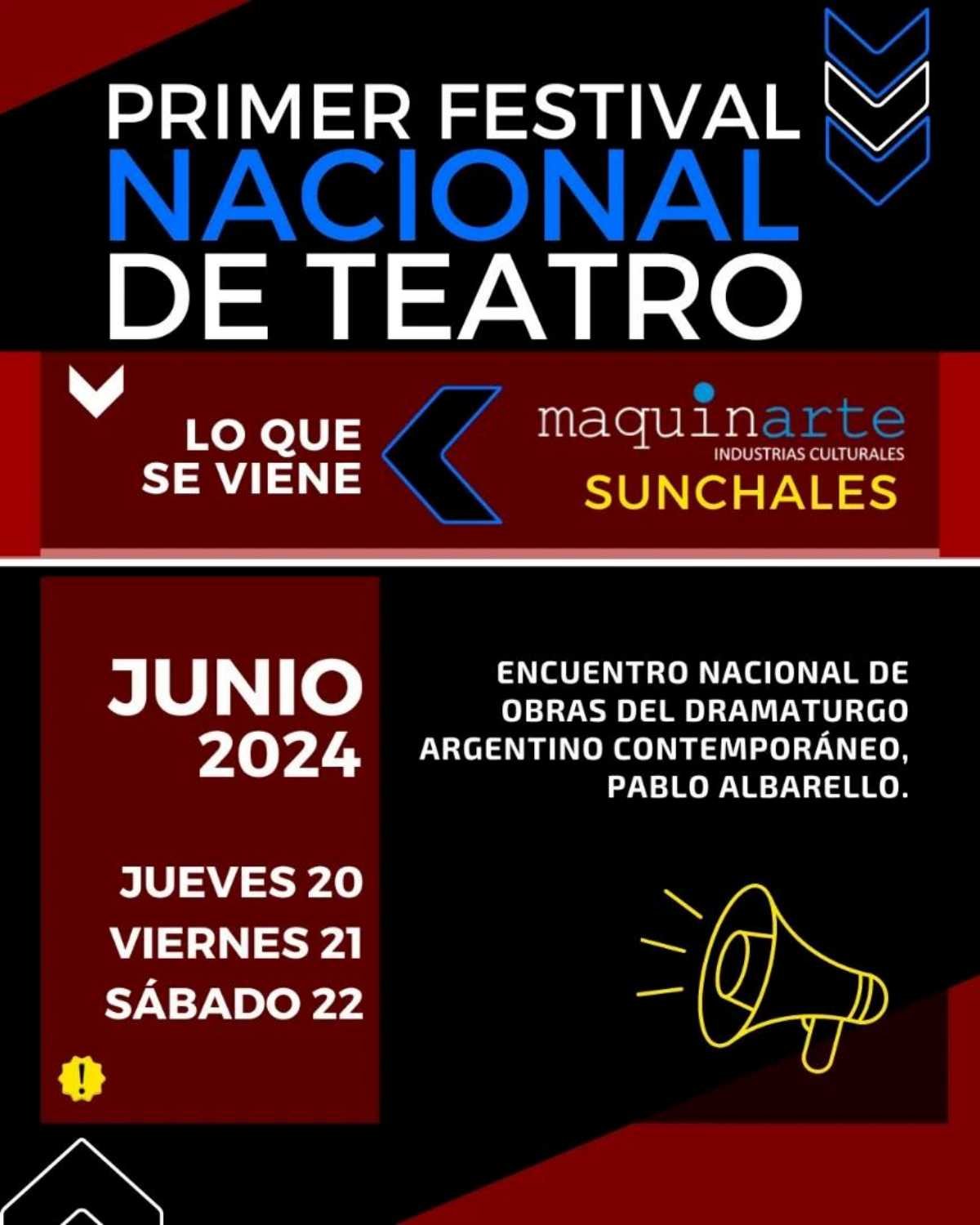 Con la organización del grupo «Maquinarte», se organiza el primer Festival Nacional de Teatro. Si bien a lo largo de las próximas semanas se estarán difundiendo los detalles, ya se sabe que se extenderá por tres días, entre el jueves 20 y sábado 22 de junio próximo, acudiendo a la ciudad elencos de diferentes partes del país.