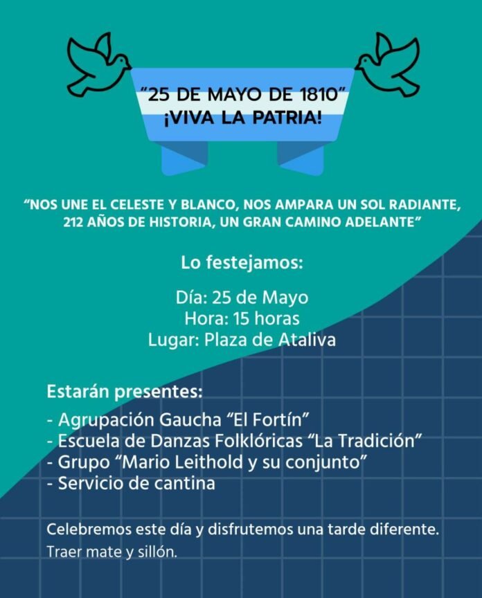 La Comuna de Ataliva dio a conocer el cronograma de actividades especiales que se organizan para el venidero 25 de Mayo. Las celebraciones incluyen propuestas populares a partir de la hora 15 con la participación de grupos musicales y diferentes participaciones.