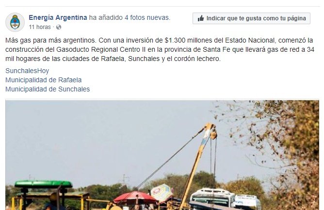 «Más gas para más argentinos. Con una inversión de $1.300 millones del Estado Nacional, comenzó la construcción del Gasoducto Regional Centro II en la provincia de Santa Fe que llevará gas de red a 34 mil hogares de las ciudades de Rafaela, Sunchales y el cordón lechero».
