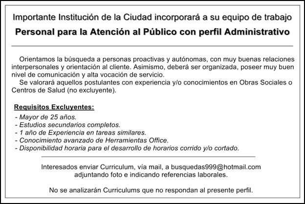 Interesados enviar Curriculum, vía mail, a busquedas999@hotmail.com, adjuntando foto e indicando referencias laborales.