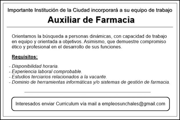 ClasificadosDestacadosEmpleos Búsqueda de Auxiliar de Farmacia 07/01/2015 Por Material de Internet 2725 Compartir FacebookTwitterWhatsAppEmail Temasbúsqueda laboralClasificadosempleotrabajo Compartir FacebookTwitterWhatsAppEmail Relacionadas San José: Búsqueda de docente de Inglés 05/02/2026 El Colegio San José busca docente de inglés 07/08/2025 Colegio «San José»: Búsqueda de docente de Inglés 14/02/2025 Ultimas noticias Carnavales: Reprogramados para mañana martes y con nuevo horario de inicio 16/02/2026 Carnavales: Reprograman la segunda noche 15/02/2026 A 24 años de la creación del Taller «Alfa Centauro» 15/02/2026
