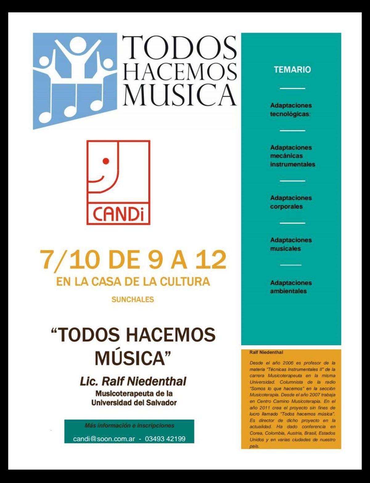 Por otra parte, se recibirá la visita del Licenciado Ralf Niedenthal, Musicoterapeuta de la Universidad del Salvador, quien ofrecerá un taller de capacitación.