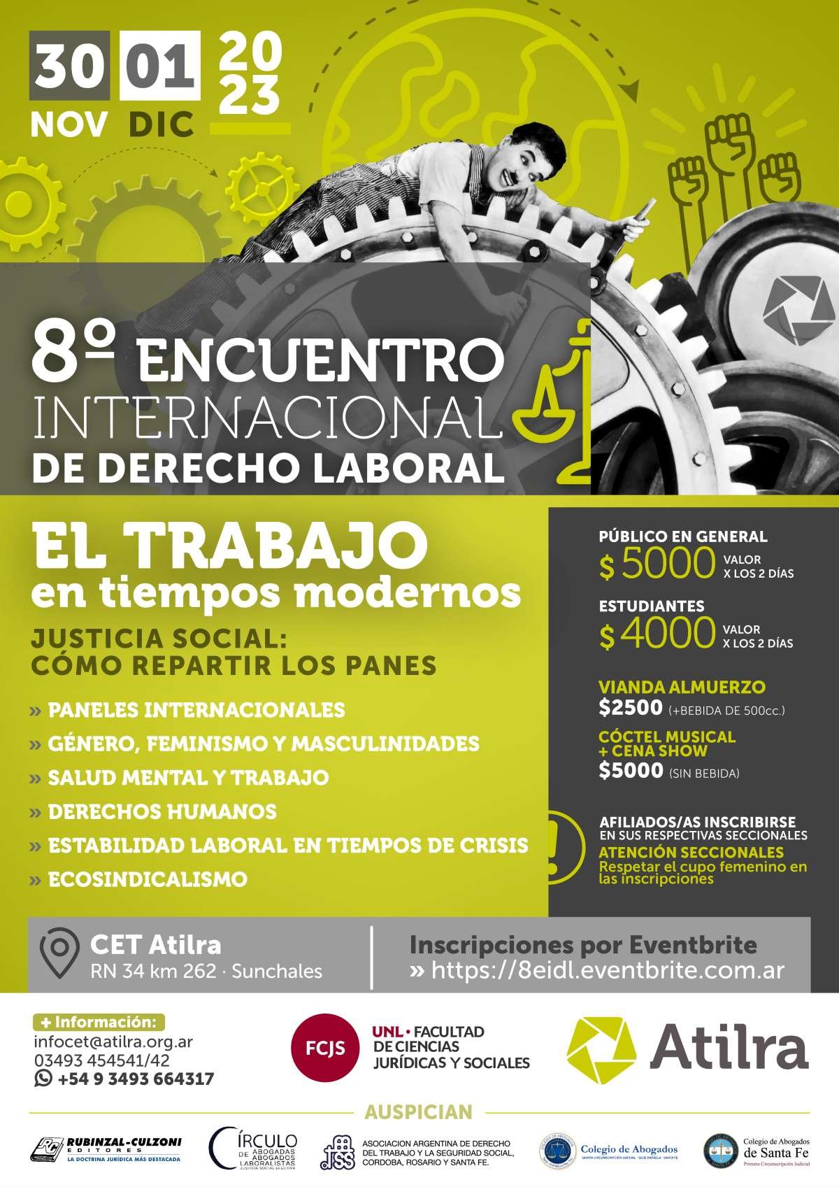 Desde el Centro Educativo Tecnológico de Atilra informaron que el próximo jueves 30 de noviembre y viernes 1º de diciembre, se desarrollará el 8° Encuentro Internacional de Derecho Laboral. El mismo es organizado anualmente en conjunto por Atilra y la Facultad de Ciencias Jurídicas y Sociales de la Universidad Nacional del Litoral.