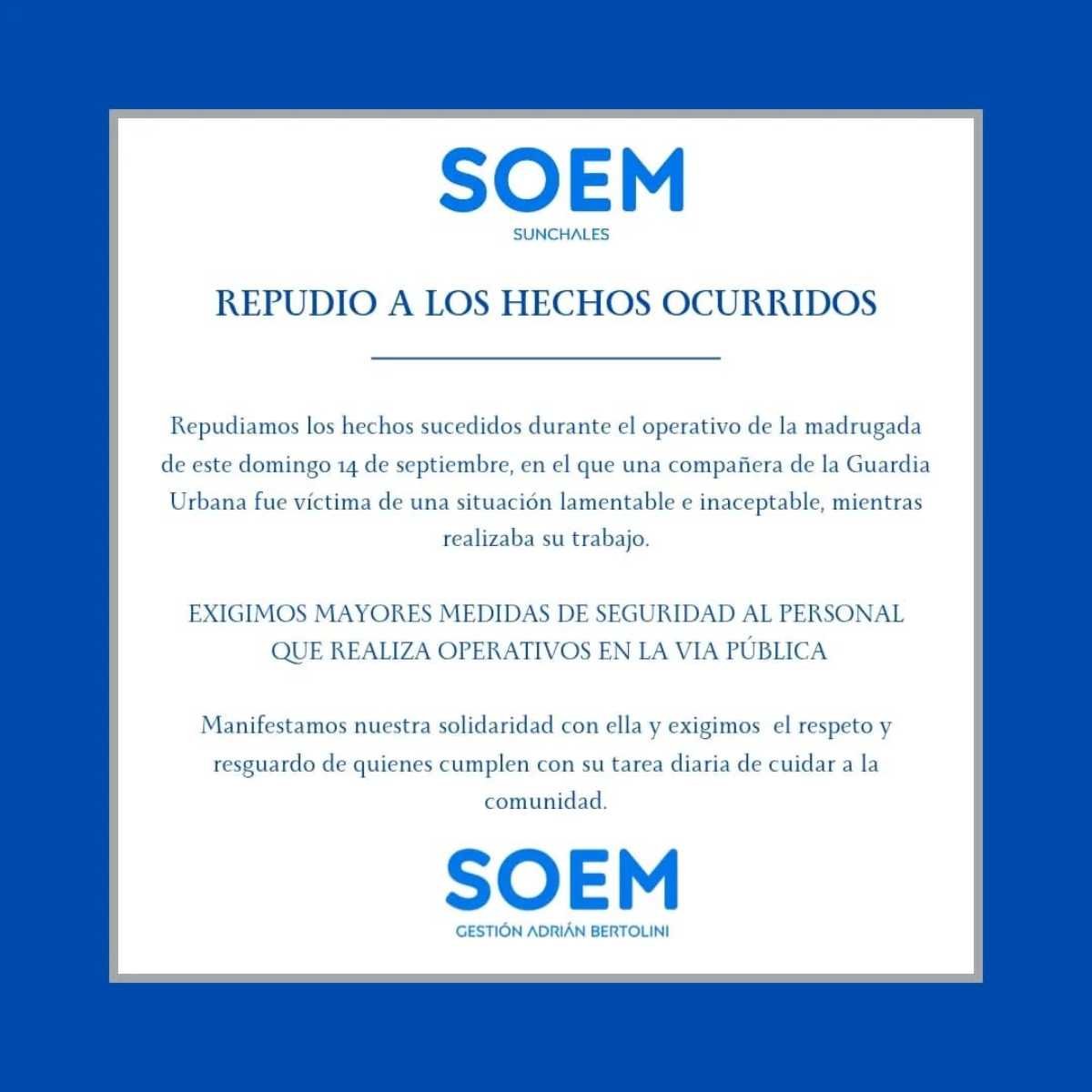 El Soem emitió su apoyo, exigiendo mayores medidas de seguridad pero llamativamente, el Municipio hasta la noche de hoy domingo no había hecho público algo similar, evitando empatizar, aún cuando una de sus agentes fue agredida en una situación que pudo haber sido mucho peor.