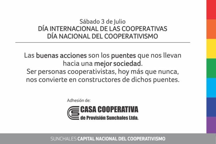 Casa Cooperativa de Provisión Sunchales Ltda. se suma a las celebraciones del 3 de julio por el Día Internacional de las Cooperativas y Día Nacional del Cooperativismo, que se realizarán bajo el lema “Reconstruir mejor juntos”. Se trata de una oportunidad para que las cooperativas de todo el mundo muestren cómo están afrontando la crisis provocada por la pandemia de COVID-19 con solidaridad y resiliencia, ofreciendo a las comunidades una recuperación centrada en las personas y respetuosa con el medioambiente.