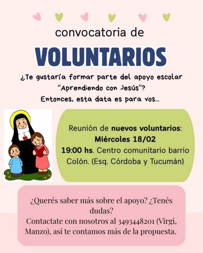 Sociedad Convocan a voluntarios para el Apoyo Escolar de barrio Colón 12/02/2026 Por Redacción SH 31 Compartir FacebookXWhatsAppEmail Ante el próximo inicio de ciclo lectivo escolar, desde el Centro Comunitario de Barrio Colón se convoca a voluntarios que quieran sumarse y ser parte de esta propuesta: Temasapoyo escolarbarrio colónvoluntarios Compartir FacebookXWhatsAppEmail Relacionadas Reconocieron a Voluntarios 28/03/2026 Preocupación por daños en el CAP N° 3 «Débora Ferrandini» 05/02/2026 A 54 años de la creación del Barrio Cristóbal Colón 12/10/2025 Ultimas noticias Golf: Los Timboes disputó su Torneo Apertura 04/04/2026 Ruta N° 34: La Provincia informó sobre el desvío a la altura de Lehmann 04/04/2026 LRF Senior – F1: Libertad deberá esperar para el debut 04/04/2026