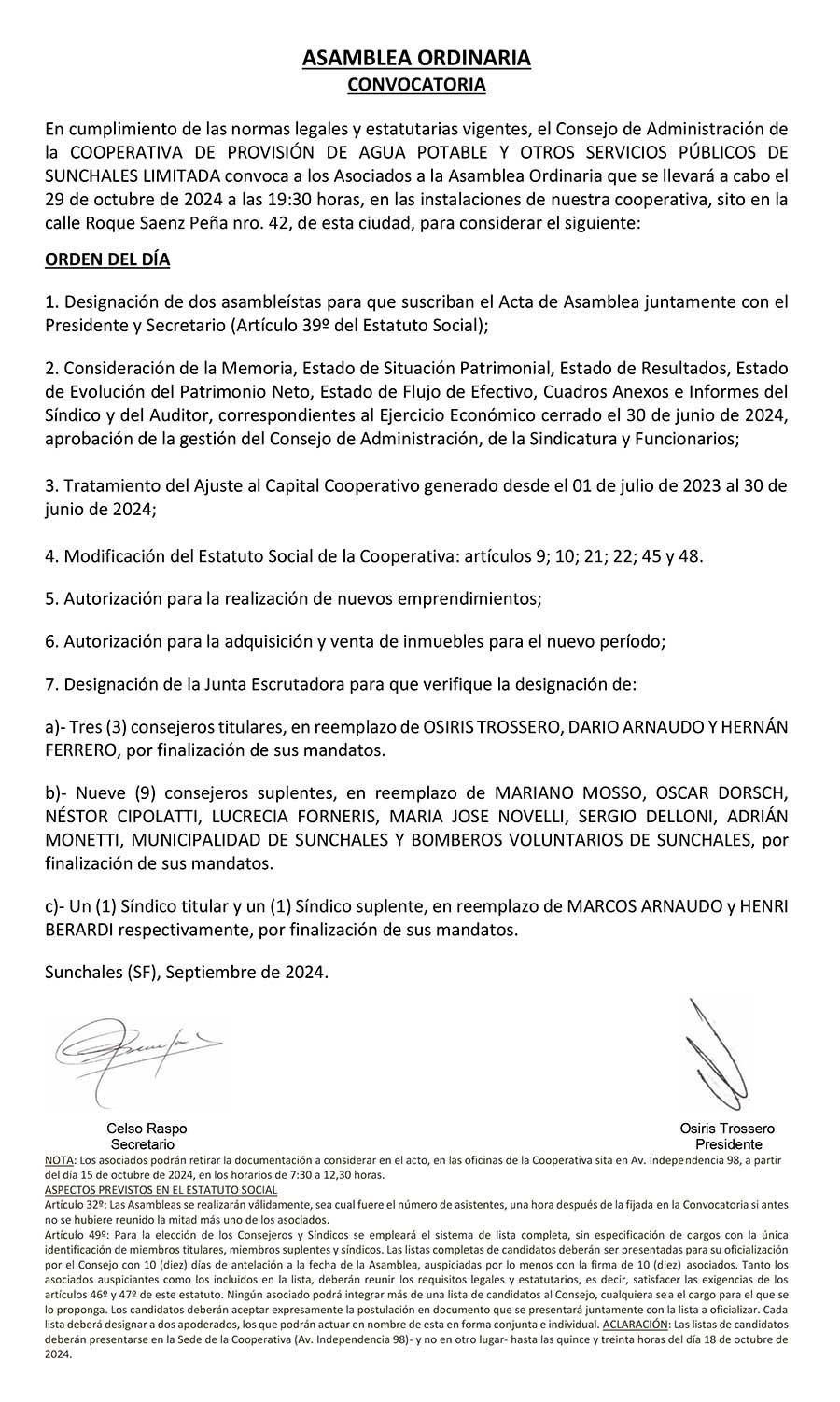 Publinota Cooperativa de Agua Potable convoca a Asamblea General Ordinaria 14/10/2024 Por Redacción SH 27 Compartir FacebookXWhatsAppEmail La Cooperativa de Agua Potable y Otros Servicios Públicos, convoca a sus asociados a participar de la Asamblea General Ordinaria, la cual se desarrollará el venidero 29 del corriente mes. Temasagua potableasambleacooperativa de agua Compartir FacebookXWhatsAppEmail Relacionadas A 68 años de la puesta en marcha de la Cooperativa de Agua Potable 11/11/2025 Cooperativa de Agua: Adrián Monetti es el nuevo Presidente 03/11/2025 La Cooperativa de Agua Potable renovó la concesión del servicio 08/10/2025 Ultimas noticias ARB Formativas – F3: Actividad para los chicos de Unión y Libertad 03/04/2026 Sunchalense estafado al intentar comprar un auto en Rafaela 03/04/2026 Homenaje a Gustavo Miretti y a quienes yacen en el gélido sur 02/04/2026