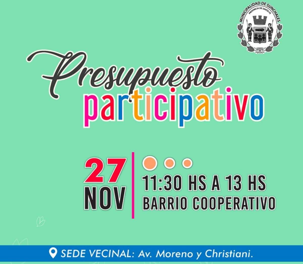 El Municipio local junto a la Comisión Vecinal del barrio Cooperativo, convoca a vecinos del sector a participar de la Jornada de Elecciones Abiertas del Presupuesto Participativo. La cual se realizará el próximo sábado en la Sede Vecinal (Av. Moreno y Christiani).