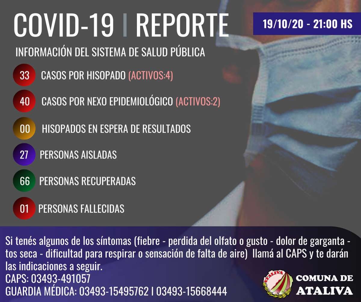 Por intermedio de su Reporte Epidemiológico, la Comuna de Ataliva confirmó tres nuevos casos positivos en dicha localidad, una persona Recuperada pero también, sumó su primer deceso como consecuencia del Covid.
