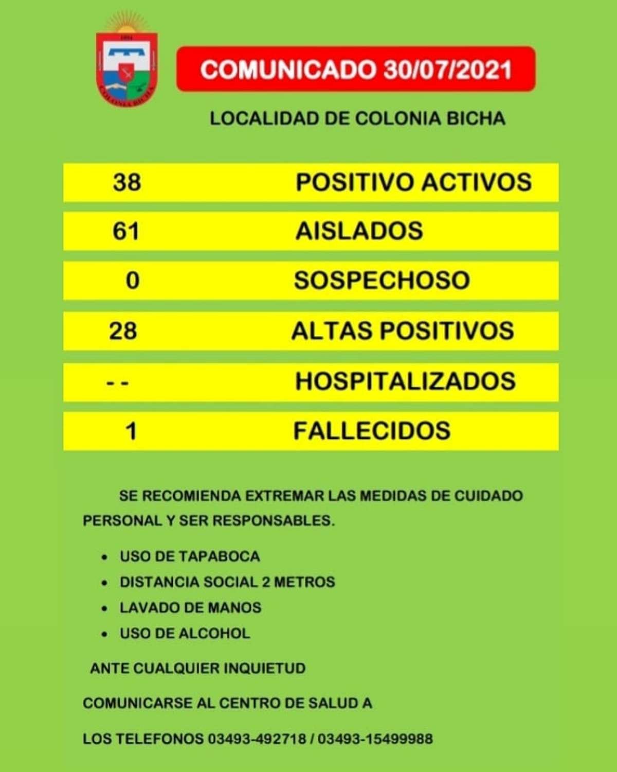 En la tarde de hoy, se dieron a conocer las cifras actualizadas, con 38 casos positivos, 61 habitantes aislados, involucrando así cerca del 30 por ciento de la población. La buena noticia es que también comienzan a darse las primeras altas.