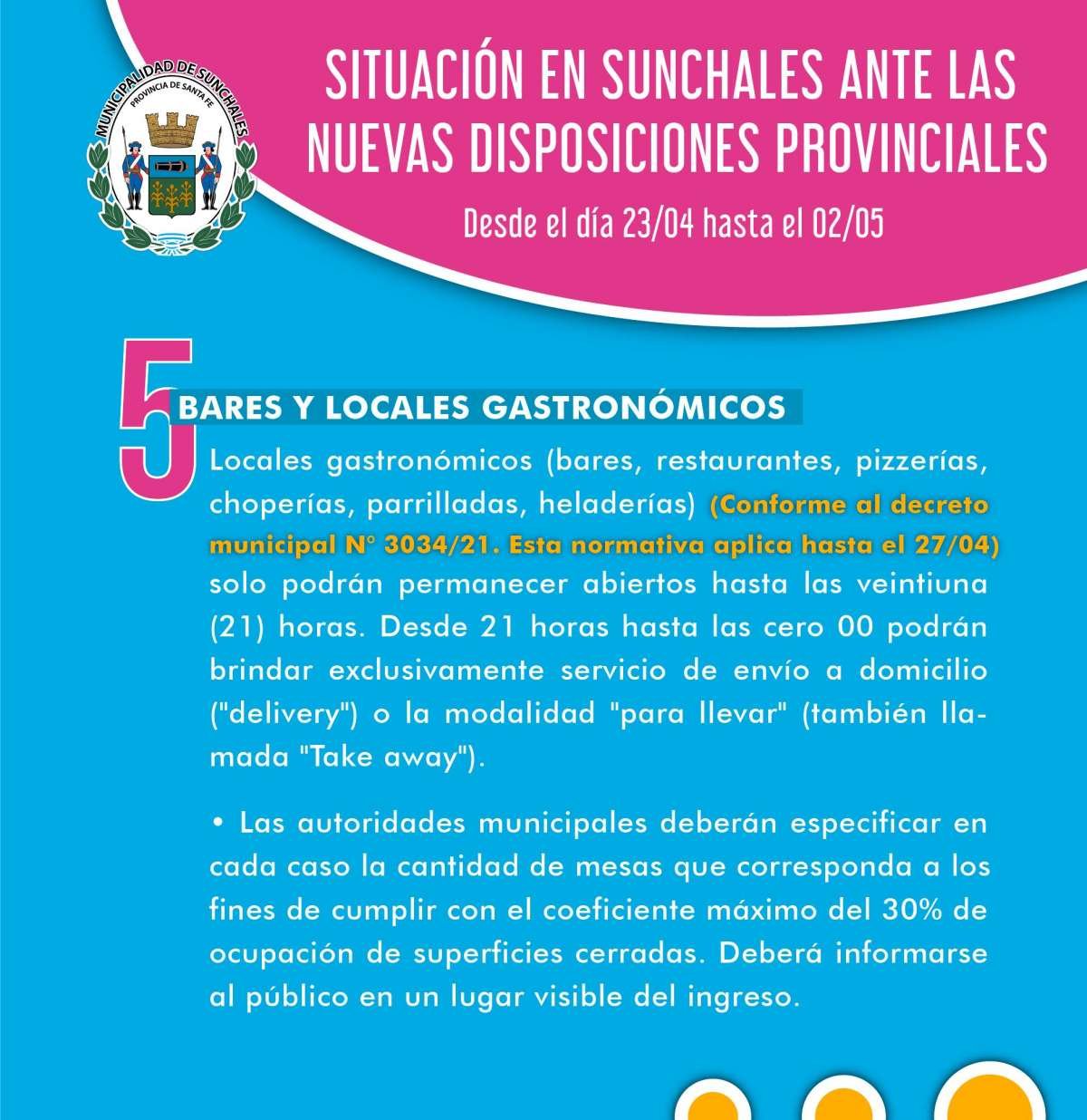 En este sentido, cabe mencionar el horario de funcionamiento de locales gastronómicos (la provincia fija hasta las 23 pero se sostendrá hasta las 21) y las prácticas deportivas en espacios cerrados (la provincia permite algunas pero a nivel local no).
