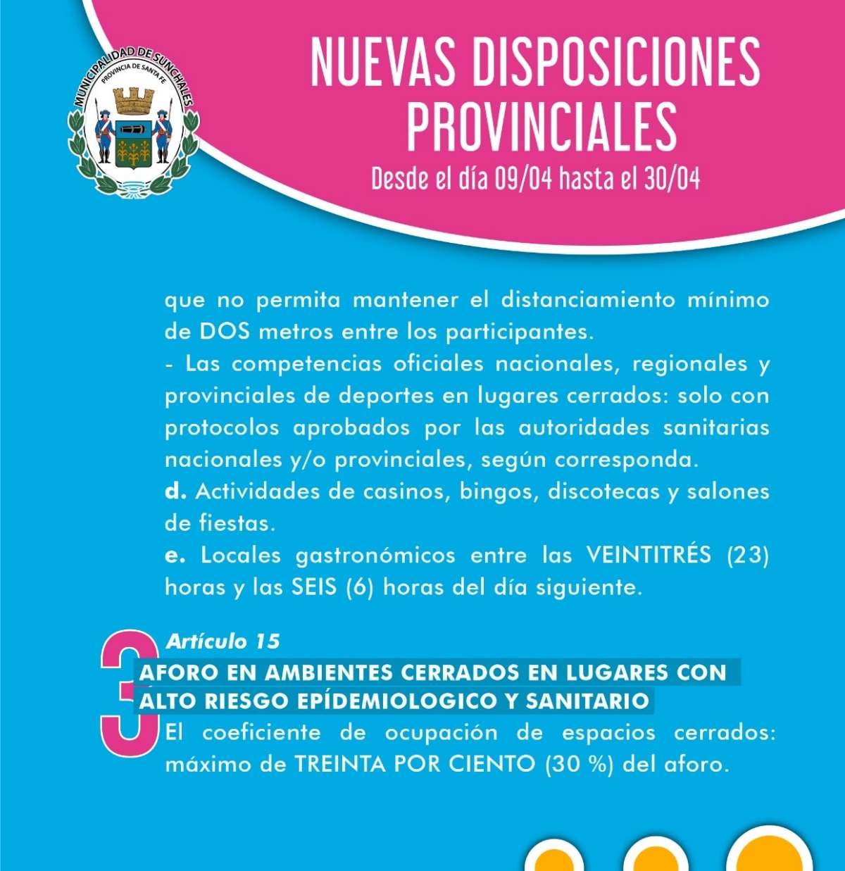 Ante la adhesión de provincia de Santa Fe al Decreto Nacional N° 235/21, la Municipalidad de Sunchales informa las nuevas disposiciones, las cuales entraron en vigencia desde las 0 horas del viernes 9/4, hasta el 30/4 inclusive.