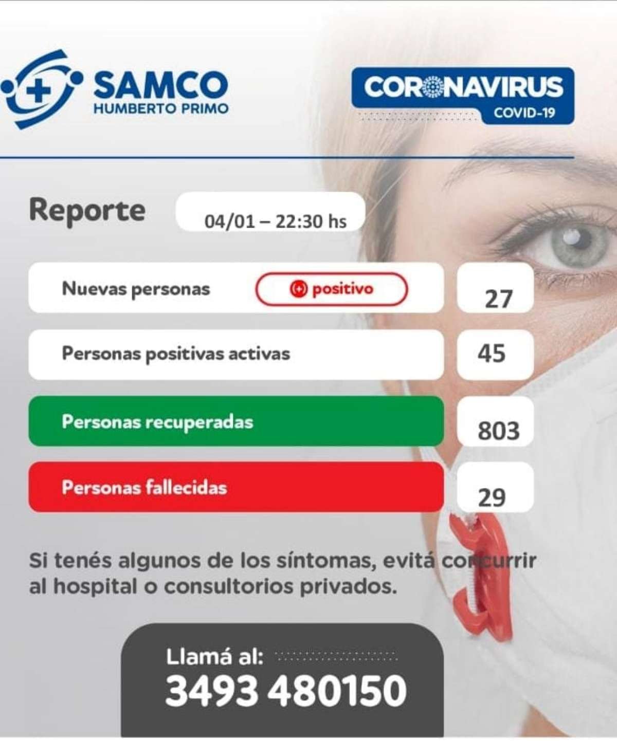 El Samco de Humberto Primo informó en el día de hoy la detección de 27 nuevos casos positivos de coronavirus. De esta manera, el total de activos se ubica en 45 personas en la localidad.