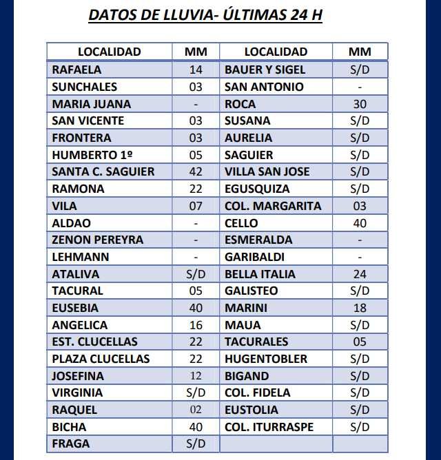Región Datos de precipitaciones del Departamento 17/02/2020 Por Redacción SH 571 Compartir FacebookXWhatsAppEmail A continuación, repasamos el informe que fuera remitido por parte del área de Relaciones Policiales correspondiente a la Unidad Regional V de Policía con respecto a las precipitaciones registradas en el Departamento en las últimas 24 horas. Temasdatos de lluviaprecipitacionespronóstico Compartir FacebookXWhatsAppEmail Relacionadas SAT: Alerta por lluvias para el martes 15/03/2026 SAT: Anticipan tormentas para la tarde de hoy 08/03/2026 SAT: Alerta Amarillo por tormentas para el martes 01/03/2026 Ultimas noticias A 92 años de la educación Técnica 02/04/2026 A 78 años del nacimiento del club Atlético Unión 02/04/2026 A 118 años del colegio «San José» 01/04/2026