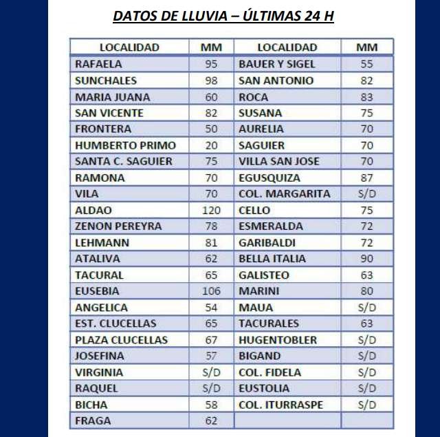 Región Datos de lluvia de las últimas 24 horas 18/03/2020 Por Redacción SH 882 Compartir FacebookXWhatsAppEmail Desde la Unidad Regional V de Policía remitieron el informe con los datos de las precipitaciones que tuvieron lugar en la jornada de ayer martes en toda la región. Temasdatos de lluviaprecipitacionespronóstico Compartir FacebookXWhatsAppEmail Relacionadas SAT: Alerta por lluvias para el martes 15/03/2026 SAT: Anticipan tormentas para la tarde de hoy 08/03/2026 SAT: Alerta Amarillo por tormentas para el martes 01/03/2026 Ultimas noticias A 118 años del colegio «San José» 01/04/2026 LRF: Inferiores sin actividad 01/04/2026 Festram: Hubo acuerdo y se desactivó el paro de la semana próxima 01/04/2026