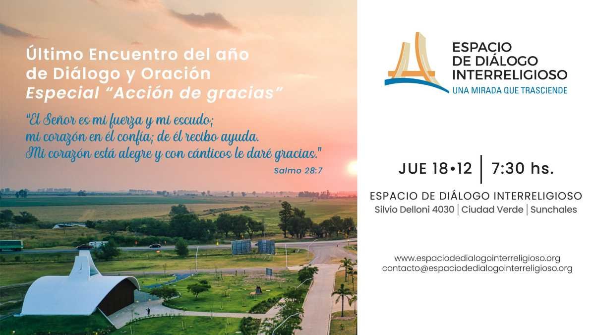 Desde el Espacio de Diálogo Interreligioso (EDI), informaron acerca del último Encuentro de Diálogo y Oración del año, el cual tendrá lugar este jueves a la hora 7.30 y que será un tiempo especial de acción de gracias.
