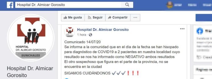 En un nuevo reporte oficial publicado en la cuenta de Facebook del hospital «Almícar Gorosito», su Directora, Carina Feldman, informó que se realizaron dos hisopados ante presuntos casos sospechosos de Covid19, los cuales arrojaron resultado negativo.