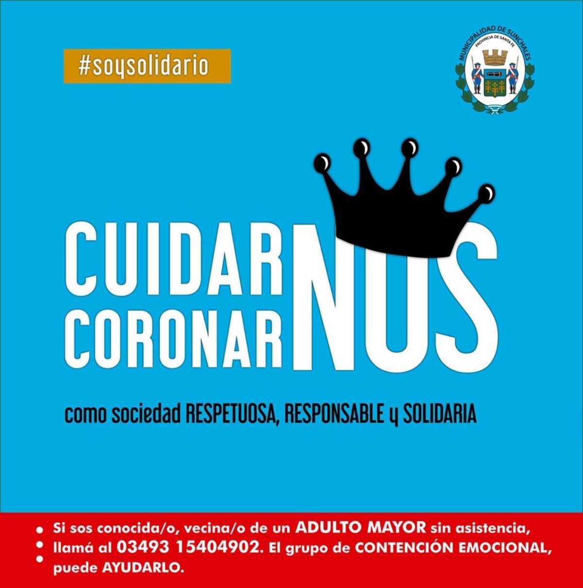 > Coronarnos con cuidado y empatía: Este eje, propone que coronarnos es cuidar a nuestros adultos mayores, colaborando con ellos, asistiéndolos tanto en lo físico como en lo emocional, prestando atención a sus cambios de hábitos para brindarles ayuda sin que la soliciten. Pone a disposición la línea 03493 15404902 (Grupo de Contención Emocional de la Municipalidad de Sunchales), para notificar cambio de hábitos, actitudes o estados de en algún adulto mayor vecino/a o cercano.