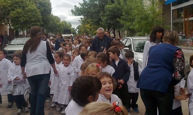 Fue así como en primer lugar estuvo en el establecimiento educativo, interactuando con la comunidad educativa de nivel Primario e Inicial, para luego ser parte activa de la procesión que recorrió el perímetro de la escuela. En dicho momento abundaron los diálogos, cantos e interacciones con los pequeños y con los padres Lucas y Antonio que también fueron parte de la iniciativa.