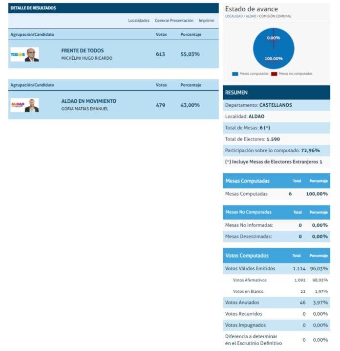 Elecciones 2021RegiónAldao Elecciones 2021: Hugo Michelini continúa al mando de Aldao 15/11/2021 Por Redacción SH 35 Compartir FacebookXWhatsAppEmail Así quedó determinado tras el recuento, en donde el actual mandatario sumó 613 respaldos contra 479 de Matías Goria, quien se erigió como contrincante en estas elecciones generales. TemasAldaoElecciones 2021Hugo Michelini Compartir FacebookXWhatsAppEmail Relacionadas LRF – F14: Ganó Unión, perdió Libertad 07/11/2025 Regional Amateur – F3: Designaciones para los sunchalenses 06/11/2025 Regional Amateur: Todo listo para el inicio 09/10/2025 Ultimas noticias LRF Infantiles – F1: Actividad para los peques de Unión 18/03/2026 Box: Noche de profesionales 18/03/2026 LRF Apertura – F2: El clásico se juega el domingo 17/03/2026
