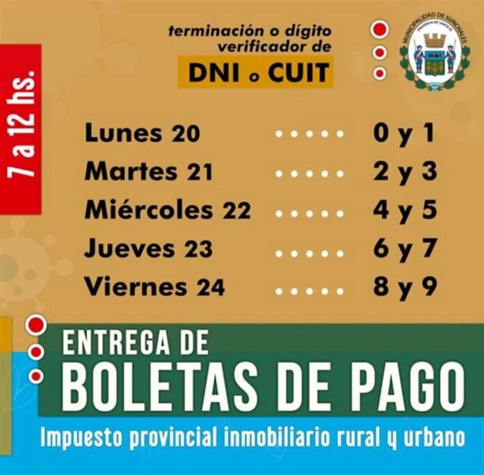 Desde la Municipalidad comunicaron que en Mesa de Entrada del Palacio Municipal se continúa realizando la entrega de las boletas de contribuciones provinciales (impuesto inmobiliario rural y urbano) acoplándose al día de la semana asignado en el cronograma que contempla el último número de DNI para las personas humanas y el dígito verificador del CUIT para las personas jurídicas.