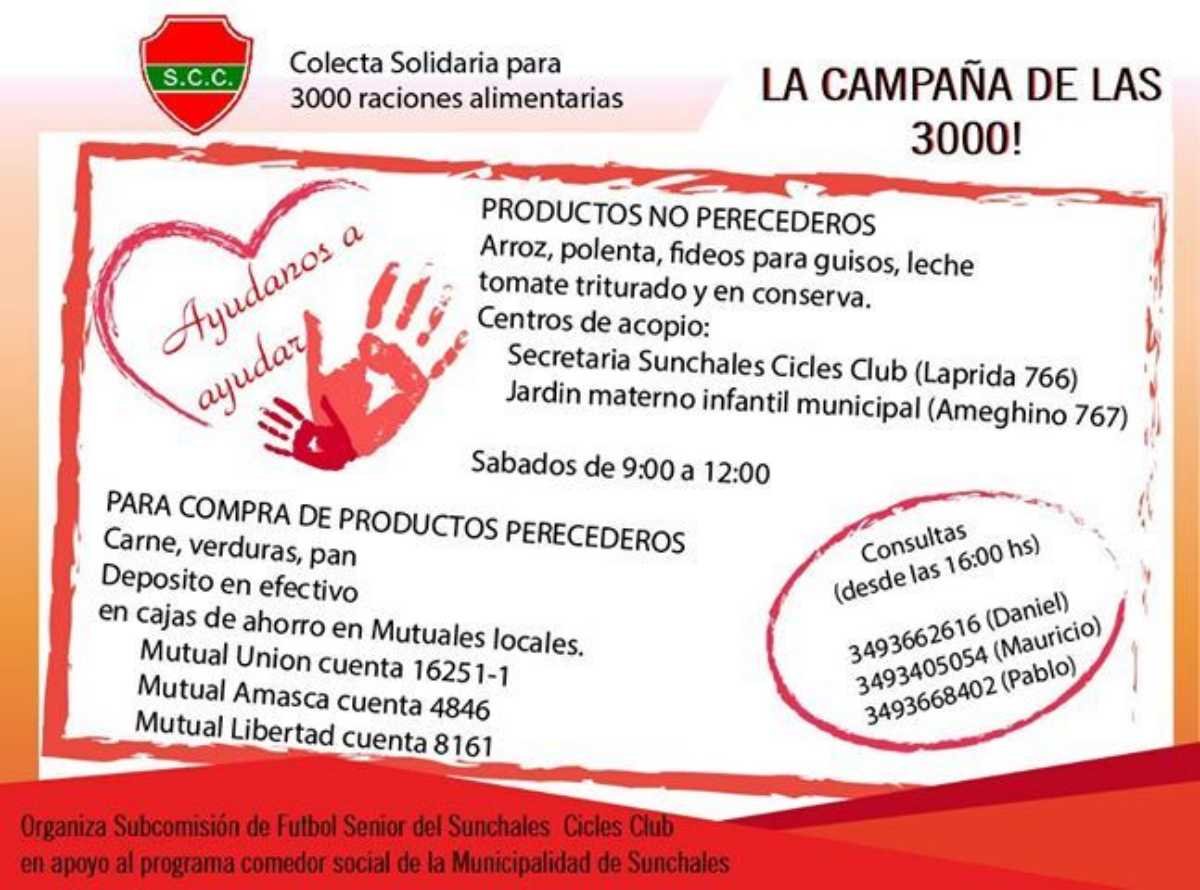 La “Campaña de las 3000”, es organizada por la Subcomisión de Fútbol Senior del Sunchales Cicles Club en apoyo al programa comedor social de la Municipalidad de Sunchales y tiene como objetivo poder generar 3000 raciones adicionales de alimentos destinadas a niños y adultos beneficiarios del programa “Comedor Social” de la Municipalidad de Sunchales.