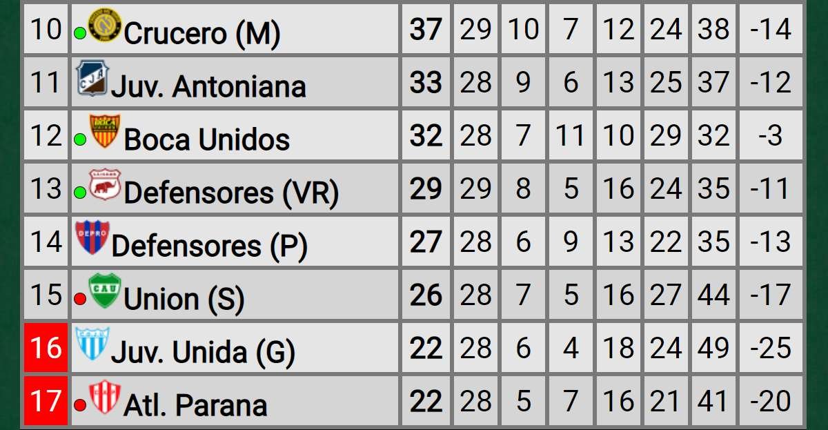 No obstante, el triunfo de Juventud Unida de Gualeguaychú lo volvió a meter en la pelea, dejándolo también a cuatro puntos al que será el próximo rival de Unión en Sunchales. Si el Bicho le gana, le sacaría 7 puntos con 9 en juego y si Paraná no suma, podría prácticamente asegurarse la permanencia de manera anticipada.