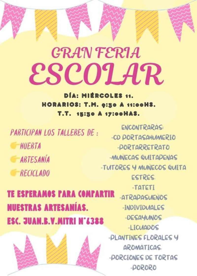 Educación Feria escolar de la escuela Juan B.V. Mitri 09/10/2023 Por Redacción SH 25 Compartir FacebookTwitterWhatsAppEmail Desde la escuela Nº 6388 «Juan B.V. Mitri», se convoca a una feria escolar, la cual se desarrollará el miércoles. En la misma se podrán ver elementos confeccionados en los diferentes Talleres que funcionan en dicho espacio. Temasescuela mitri Compartir FacebookTwitterWhatsAppEmail Relacionadas A 72 años de la creación de la escuela «Juan B.V. Mitri» 27/01/2026 La escuela Mitri y sus 71 años de funcionamiento 27/01/2025 Escuela Mitri: Visita de Estela Cadoppi 02/10/2024 Ultimas noticias Concejo: Comienzan las Sesiones Ordinarias 04/03/2026 Nuevo sector de estacionamiento para remises en la Terminal de Ómnibus 04/03/2026 Amigos del Arte: Alejandro Cagliero es el nuevo Presidente 04/03/2026