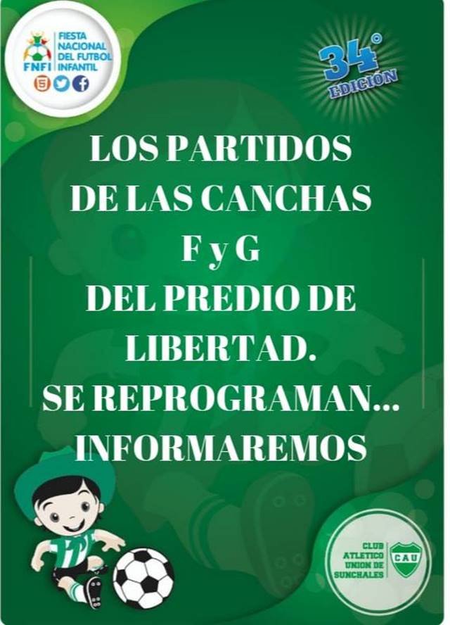 Los inoportunos 15 milímetros caídos en la mañana de hoy obligaron a los organizadores de la 34° Fiesta Nacional del Fútbol Infantil a la reprogramación de los partidos, los cuales se ponen en marcha en la tarde. También se postergó el acto inaugural de la noche de hoy viernes.