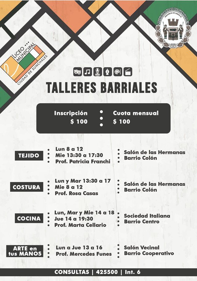 Desde el Municipio local se informó que las inscripciones para talleres barriales, propuestos por el Liceo Municipal «Intendente Julio César Sartini», están abiertas. La inscripción tiene un costo de 100 pesos, así como la cuota mensual.