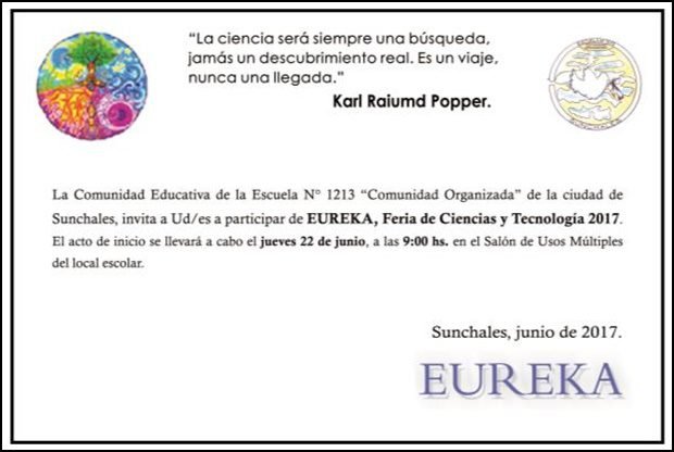 La Comunidad Educativa de la escuela Nº 1213 “Comunidad Organizada”, sede de la Instancia Zonal de “Eureka, Feria de Ciencias y Tecnología 2017”, solicita se difunda esta jornada pedagógica que se llevará a cabo el día de mañana jueves 22, a partir de las 9 hasta las 15.30 aproximadamente.