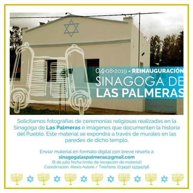 Región Las Palmeras: Preparan la reinauguración de la sinagoga 13/05/2019 Por Redacción SH 406 Compartir FacebookXWhatsAppEmail Anticipándose a la reinauguración de la sinagoga, desde la Comuna de Las Palmeras convocan a enviar fotografías de ceremonias o actividades desarrolladas en la misma. Temaslas Palmerassinagoga Compartir FacebookXWhatsAppEmail Relacionadas Las Palmeras festeja 118 años de vida 12/10/2022 Las Palmeras prepara sus festejos patronales 27/04/2022 Las Palmeras celebra sus 117 años de vida 12/10/2021 Ultimas noticias Ruta 34: Alerta por daños en la zona de la alcantarilla reparada 15/04/2026 Bochas: Destacada participación de la escuelita del Belgrano en San Guillermo 15/04/2026 ARB Formativas – F4: Actividad para los equipos de Unión 15/04/2026