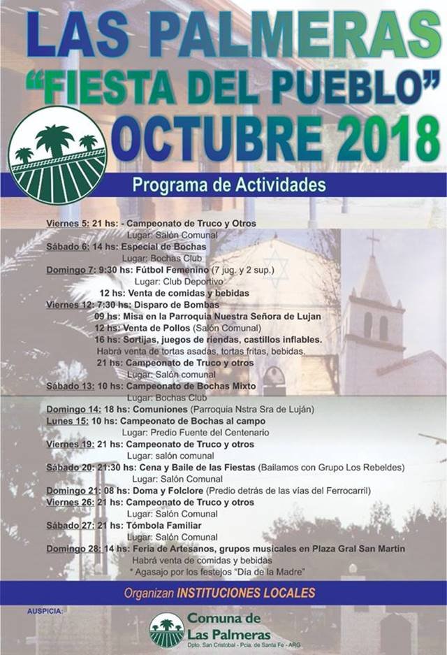Región Las Palmeras se prepara para la «Fiesta del Pueblo» 03/10/2018 Por Redacción SH 580 Compartir FacebookTwitterWhatsAppEmail Como cada año para esta fecha, la Comuna se prepara para una serie de actividades para festejar junto a los vecinos un nuevo aniversario con «La fiesta del pueblo». Temaslas Palmeraspatronales Compartir FacebookTwitterWhatsAppEmail Relacionadas Las Palmeras festeja 118 años de vida 12/10/2022 Aldao: Masivos festejos de la Fiesta Patronal 19/07/2022 Aldao: Todo listo para las Patronales 27/06/2022 Ultimas noticias Concejo: Comienzan las Sesiones Ordinarias 04/03/2026 Nuevo sector de estacionamiento para remises en la Terminal de Ómnibus 04/03/2026 Amigos del Arte: Alejandro Cagliero es el nuevo Presidente 04/03/2026