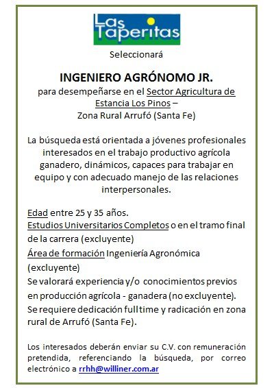 Incorporará Ingeniero Agrónomo Jr., para desempeñarse en el Sector Agricultura de Estancia Los Pinos – Zona Rural Arrufó (Santa Fe).