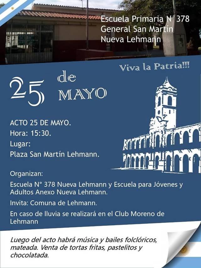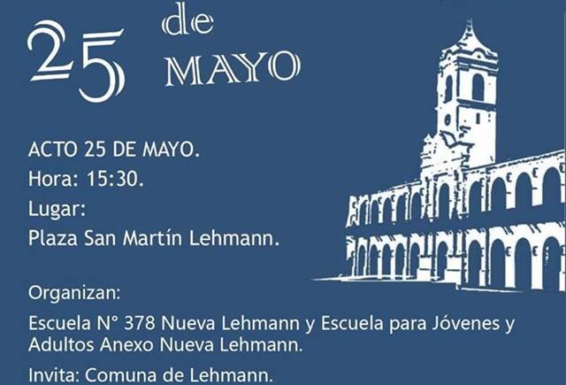 El próximo sábado 25 a las 15.30 en la Plaza “San Martín” de Lehmann se llevará a cabo el Acto Alusivo al 25 de Mayo de 1810, bajo la organización de la escuela N° 378 “Gral. Don José de San Martín” de Nueva Lehmann y la escuela Primaria para jóvenes y adultos N° 21 – Anexos Lehmann y Nueva Lehmann.
