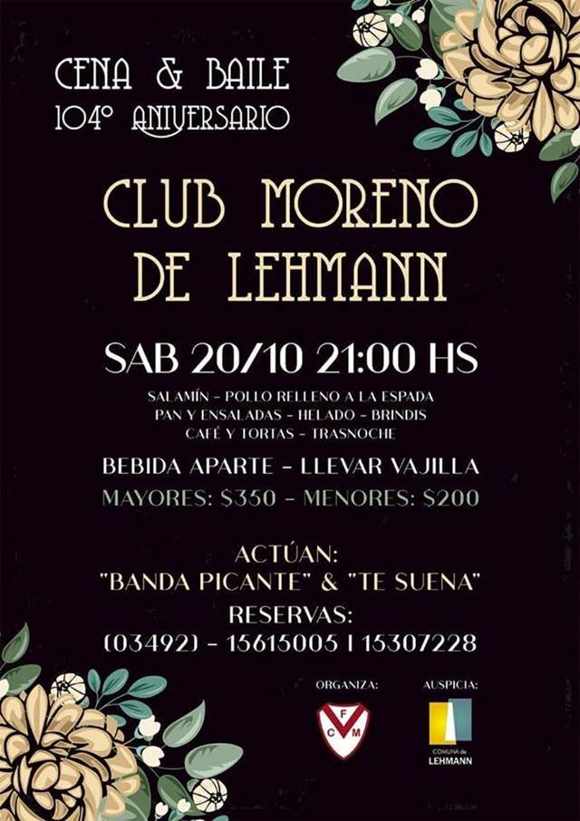 El próximo sábado 20 a partir de las 21 en el Salón del club Moreno se llevará a cabo la gran cena y baile por el 104° aniversario de la institución deportiva.