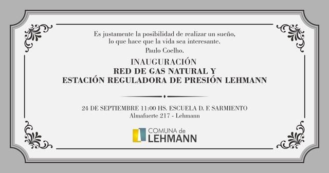 Desde la Comuna de Lehmann informaron que el próximo lunes 24 de Septiembre a las 11, en las instalaciones de la escuela N° 374 “Domingo F. Sarmiento” de esta localidad, se llevará a cabo la Inauguración de la Red de Gas Natural y Estación Reguladora de Presión de Lehmann.