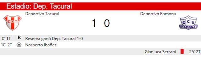 Con un tanto de Norberto Ibañez a los 20 minutos del complemento, el Deportivo Tacural superó por 1 a 0 al Deportivo Ramona, en el marco de la 12ª Fecha del Torneo Clausura de la Liga Rafaelina de Fútbol.