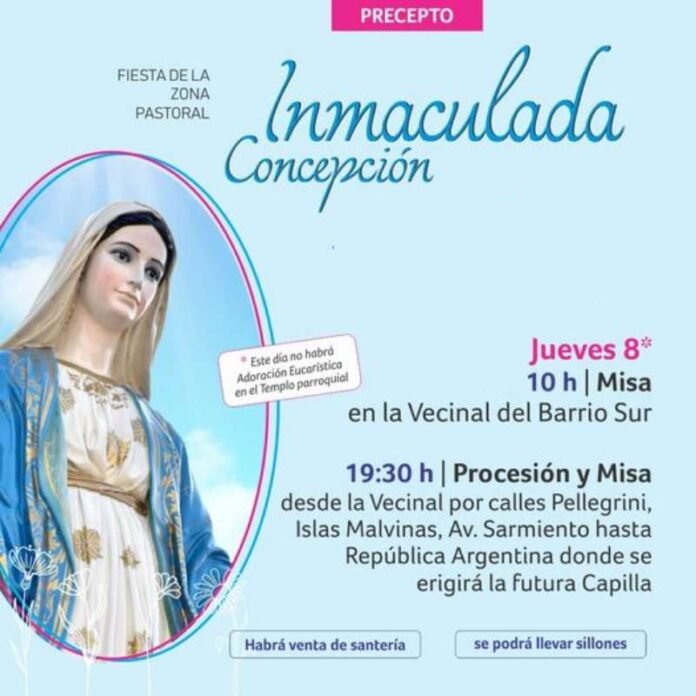 Sociedad Misas por la Inmaculada Concepción 08/12/2022 Por Redacción SH 33 Compartir FacebookXWhatsAppEmail Con actividades organizadas en el día de hoy en barrio Sur, se evocará la figura de la Virgen María. Habrá misa por la mañana y por la tarde, junto a una procesión. TemasInmaculada Concepciónmisas Compartir FacebookXWhatsAppEmail Relacionadas Actividades parroquiales 06/03/2026 Misas de Navidad en parroquia «San Carlos» 24/12/2025 Nuevos horarios de misas en la parroquia «San Carlos» 06/12/2025 Ultimas noticias El arte tiene rostro de mujer 22/03/2026 LRF – F2: Unión pone la casa para un nuevo clásico 22/03/2026 ARB F – F2: Libertad comenzó ganando 21/03/2026