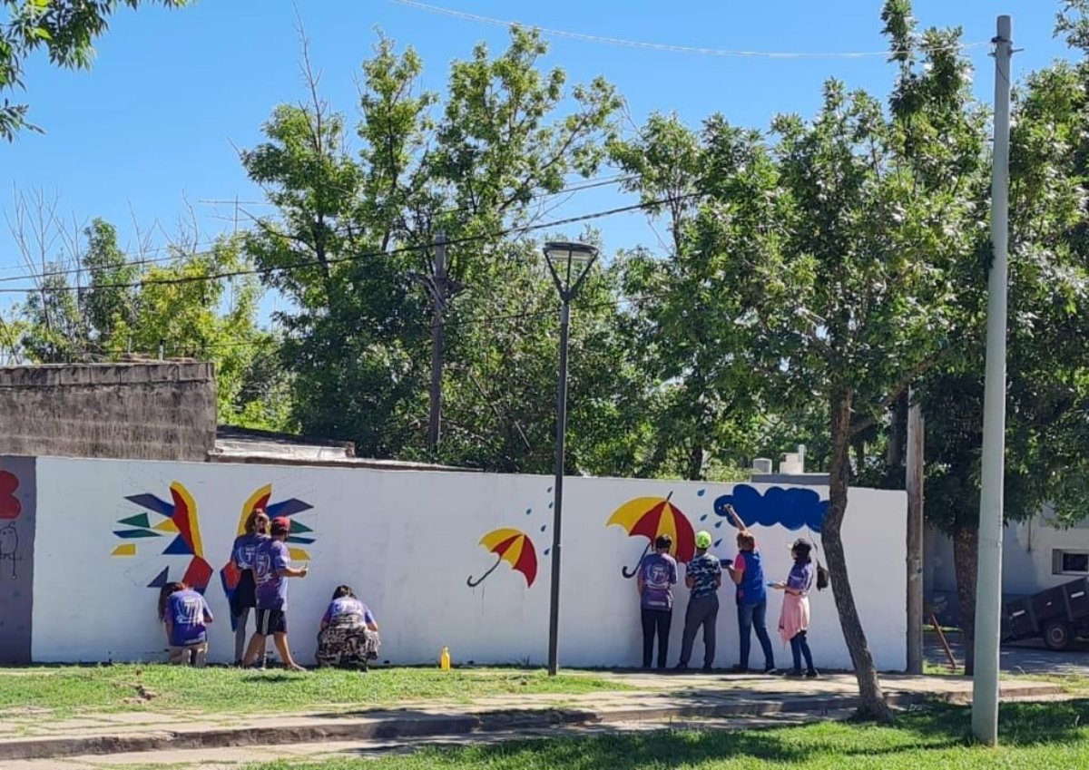 Los alumnos de Séptimo Grado de la escuela Nº 6388 «Juan B.V. Mitri», quienes apadrinan la Plaza «De los Abuelos» de nuestro barrio, en la semana anterior estuvieron presentes en la misma para realizar nuevas pinturas en su tapial.