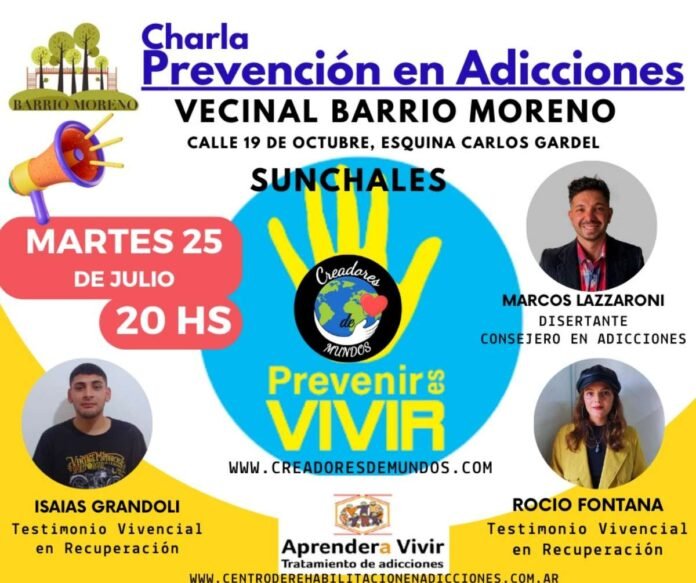 En los barriosBarrio Moreno Moreno: Convocan a charla sobre prevención de adicciones 20/07/2023 Por Redacción SH 45 Compartir FacebookTwitterWhatsAppEmail La misma se desarrollará el próximo martes, desde la hora 20, en la sede vecinal. En la oportunidad se contará con la presencia de Marcos Lazzaroni, consejero en adicciones. TemasadiccionescharlaEn los barriosMarcos LazzaroniMoreno Compartir FacebookTwitterWhatsAppEmail Relacionadas Epe: Anticipan corte de energía para el domingo 06/02/2026 EPE anticipa corte de energía para el domingo 23/01/2026 Los Pumas extendieron el comodato de su sede local 15/01/2026 Ultimas noticias Mal uso y abuso del verbo: Arrancar 16/02/2026 Carnavales: Reprogramados para mañana martes y con nuevo horario de inicio 16/02/2026 Carnavales: Reprograman la segunda noche 15/02/2026