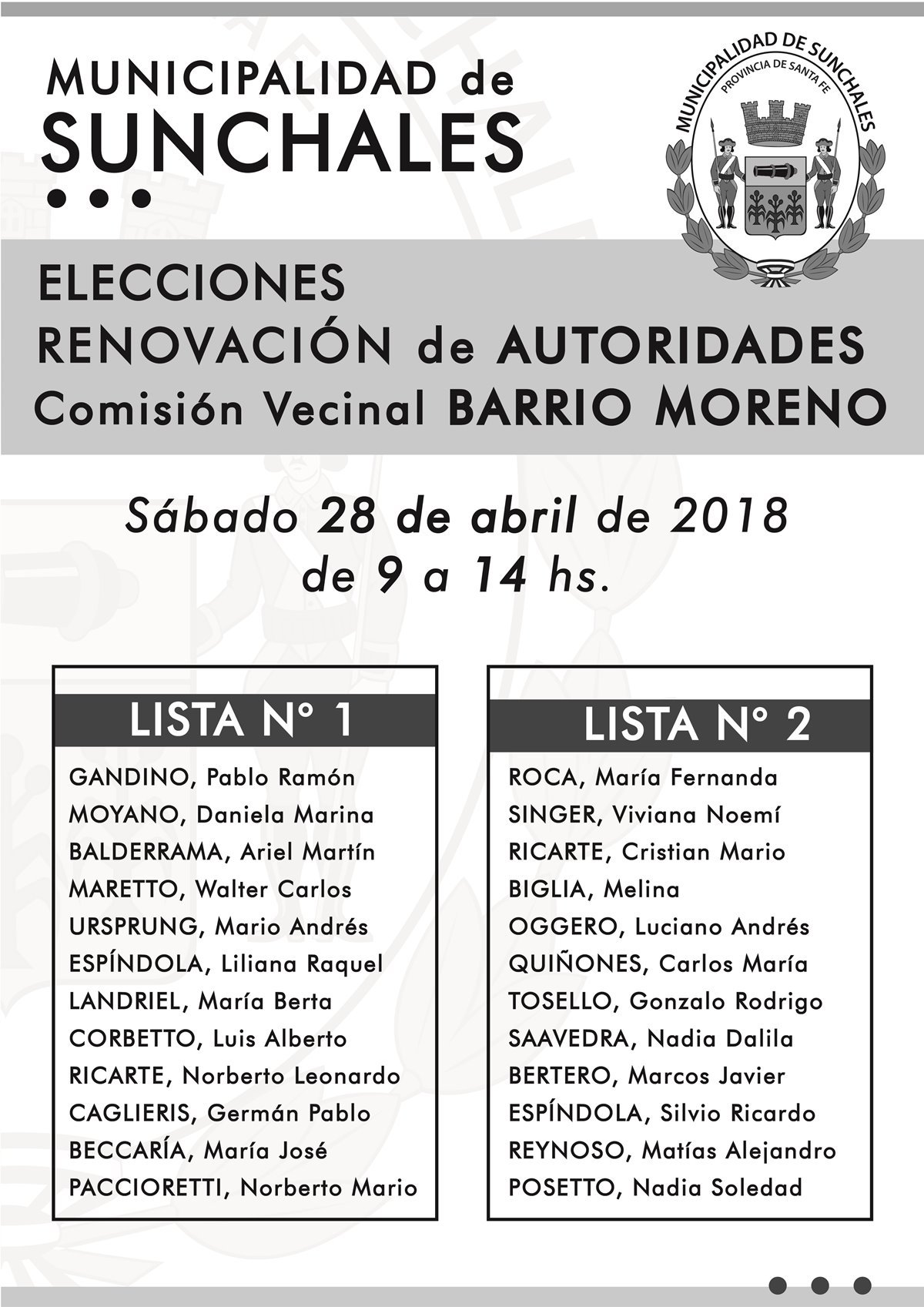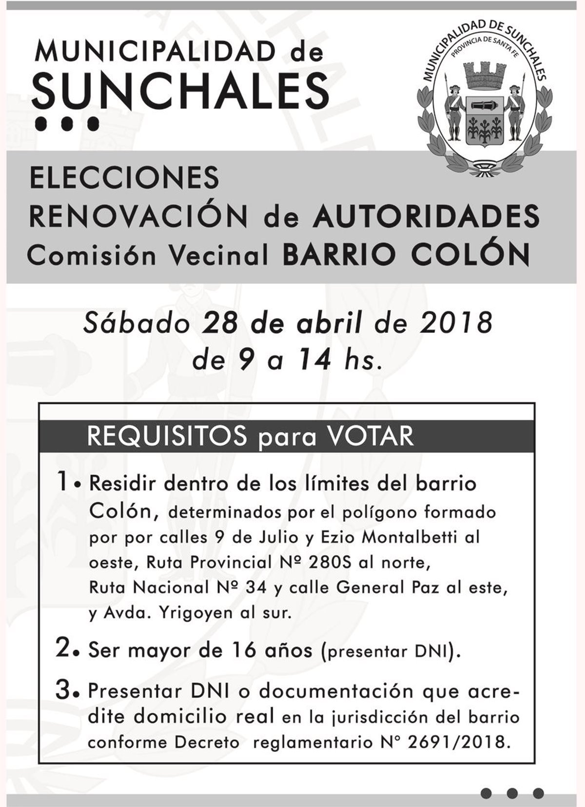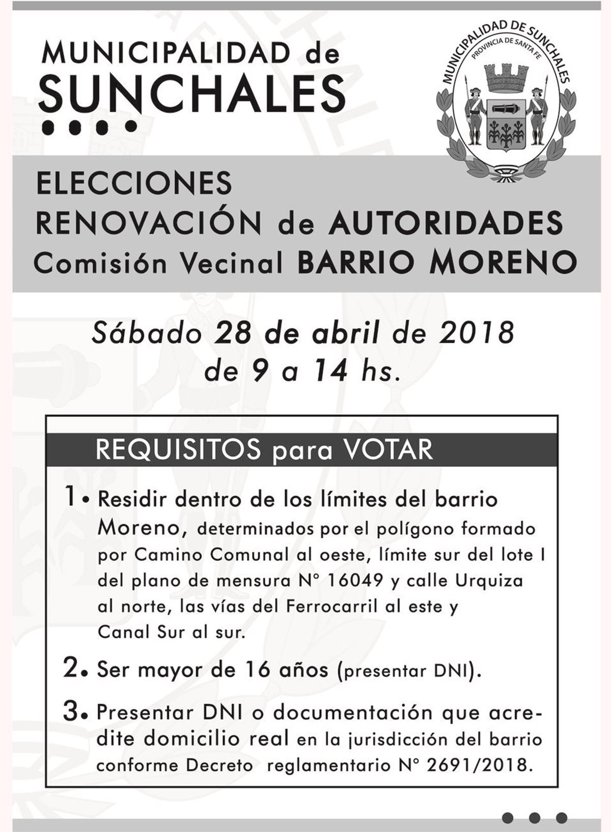La Municipalidad de Sunchales convoca a elecciones para renovar las autoridades de las comisiones vecinales de los siguientes barrios: Colón y Moreno.