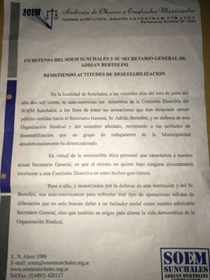 Un grupo de afiliados al Sindicato de Obreros y Empleados Municipales dio a conocer un comunicado a través del cual respaldan públicamente al Secretario General del mismo, Adrián Bertolini. A la vez, en el mismo señalan «operaciones teñidas de difamación».