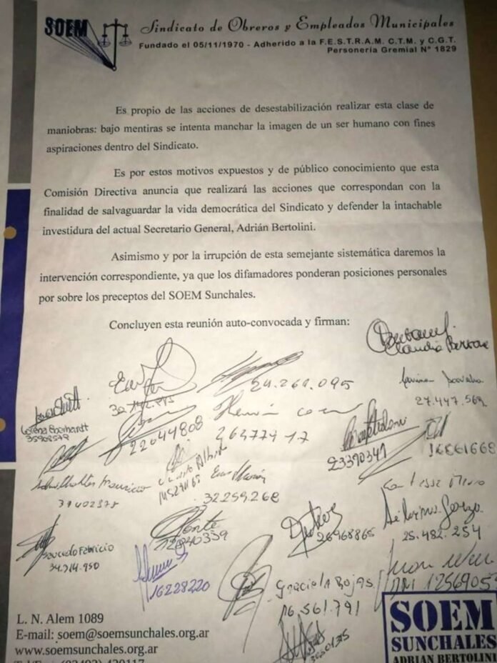 Un grupo de afiliados al Sindicato de Obreros y Empleados Municipales dio a conocer un comunicado a través del cual respaldan públicamente al Secretario General del mismo, Adrián Bertolini. A la vez, en el mismo señalan «operaciones teñidas de difamación».