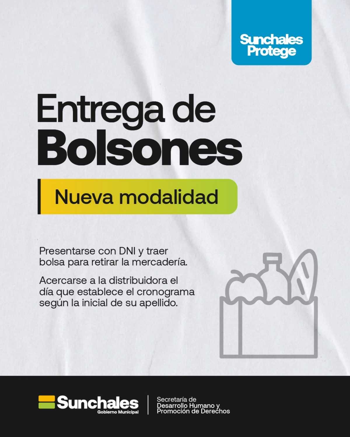 La Municipalidad de Sunchales, a través de la Subsecretaría de Promoción de Derechos, informa a los beneficiarios que se implementará una nueva modalidad de entrega de bolsones alimentarios a partir de este mes.