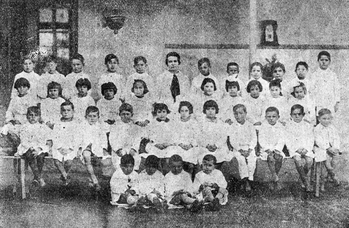 Alumnos y maestra de grado pre-escolar, turno de la tarde, de la Escuela Fiscal «Florentino Ameghino». Maestra: Sta. Lidia Gallo Montrull (Libro del cincuentenario de Sunchales, 1936).