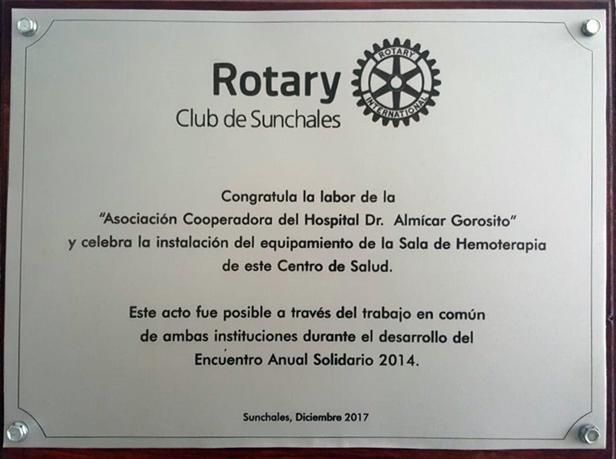 Rotary Club de Sunchales informó que en el día de ayer realizó la entrega efectiva e instalación del flamante equipamiento que posibilitará el funcionamiento de la sala de Hemoterapia en el Centro de Atención Primaria de salud «Débora Ferrandini», del barrio Colón.